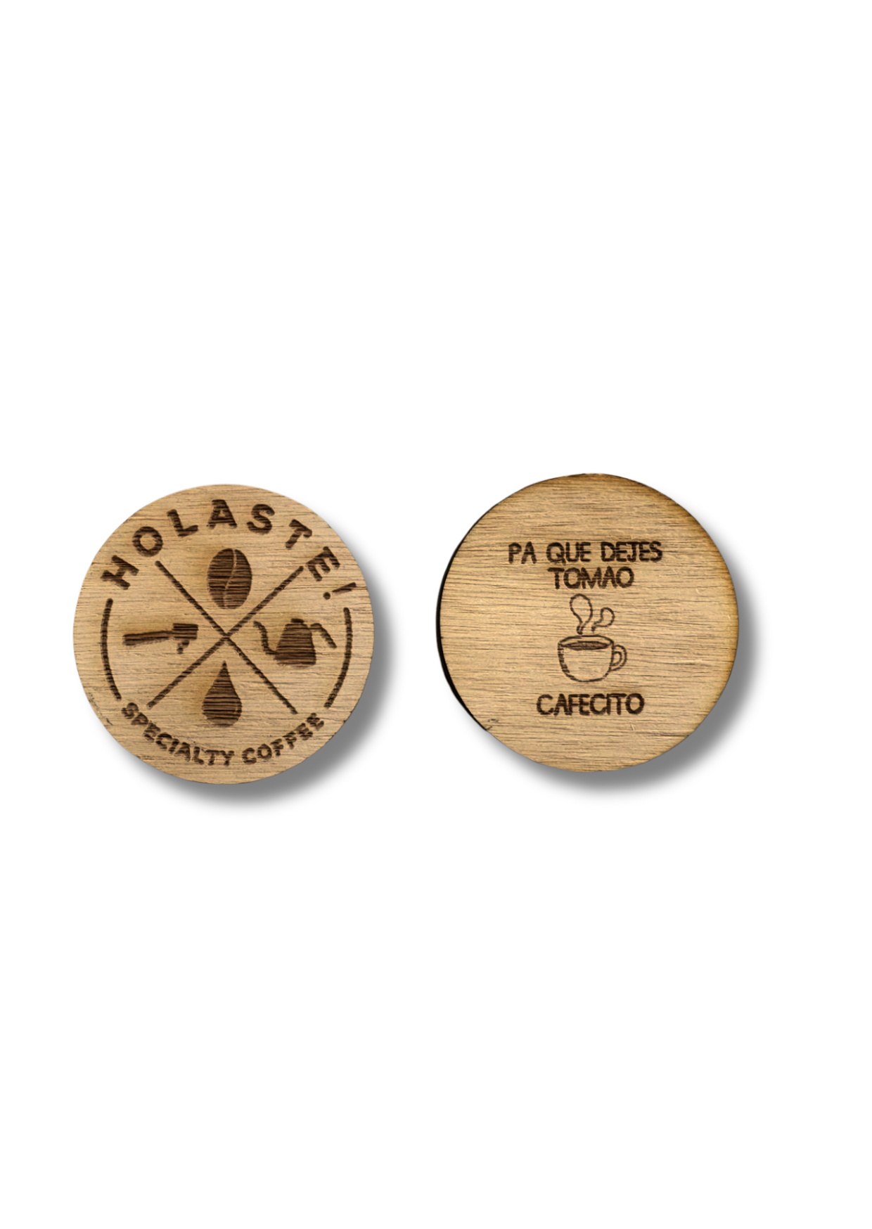 Ficha Holaste! válida por una bebida de la carta en nuestra cafetería. Hecha de madera liviana de 5cm de diámetro. Puedes canjearla presentándola cuando solicites tu cafecito u otra bebida en Holaste! Specialty Coffee.